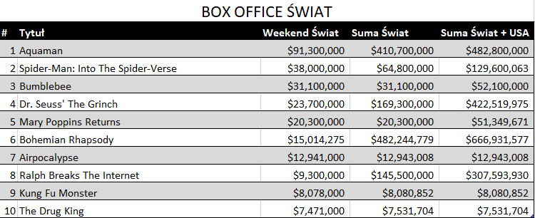 Dzięki $91 mln przychodów „Aquaman” kolejny raz nie ma sobie równych w zestawieniu światowego box office’u. „Bumblebee” i „Mary Poppins Returns” wystartowały na kilkunastu rynkach.