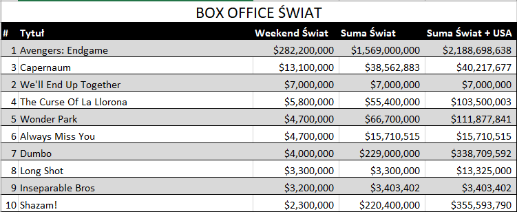 Zaledwie 11 dni wystarczyło, aby Avengers: Endgame znalazł się na drugim miejscu box office’u wszech czasów – zarówno globalnie z kwotą $2,188 mld, jak pod względem przychodów rynku zewnętrznego – $1,57 mld. W trakcie drugiego weekendu film MCU zanotował względnie niewielki spadek przychodów (55%), co dało $282,2 mln.