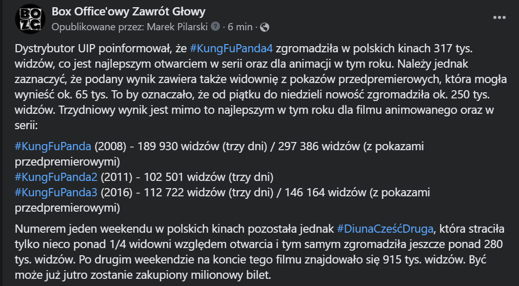 Cytat z Marek Pilarski data 18 marca, 2024, 21:18https://twitter.com/BoxOfficeRaport/status/1769816380893810909?s=20