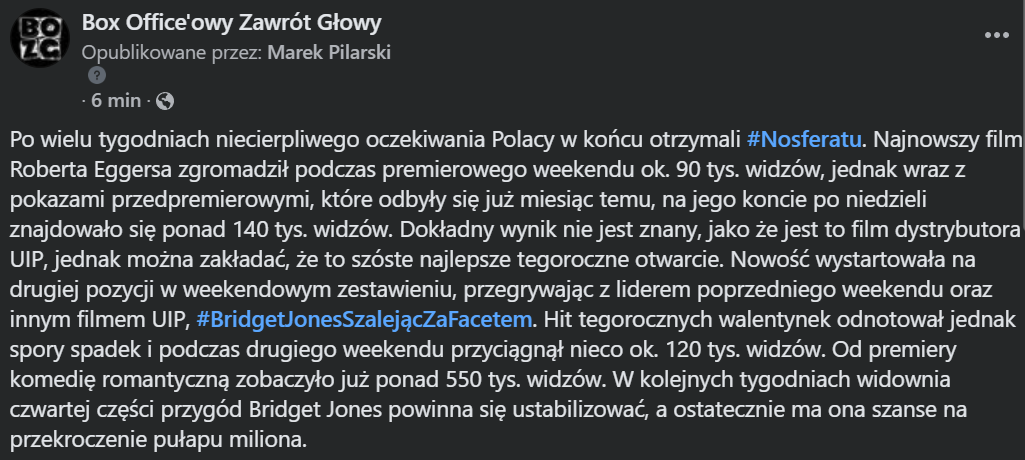 Cytat z Marek Pilarski data 25 lutego, 2025, 22:54Otwarcie Nosferatu i wynik BJ4 z drugiego weekendu