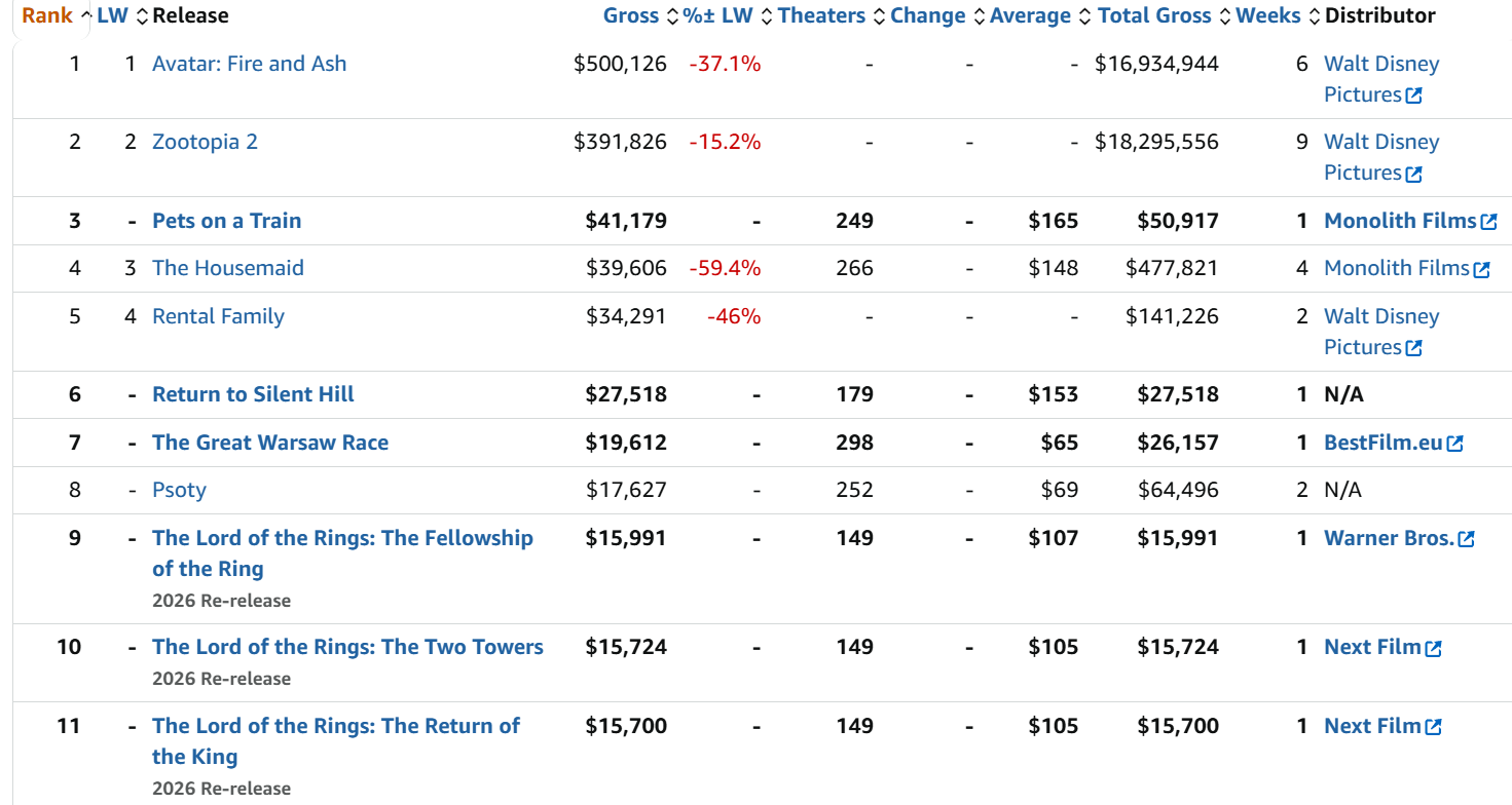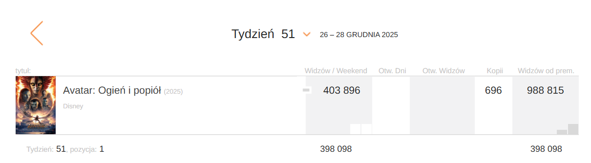 Cytat z Marek Pilarski data 30 grudnia, 2025, 23:35Tak jak przypyszczałem - u nas Avatar na tym samym poziomie, co tydzień wcześniej. Nawet mały wzrost