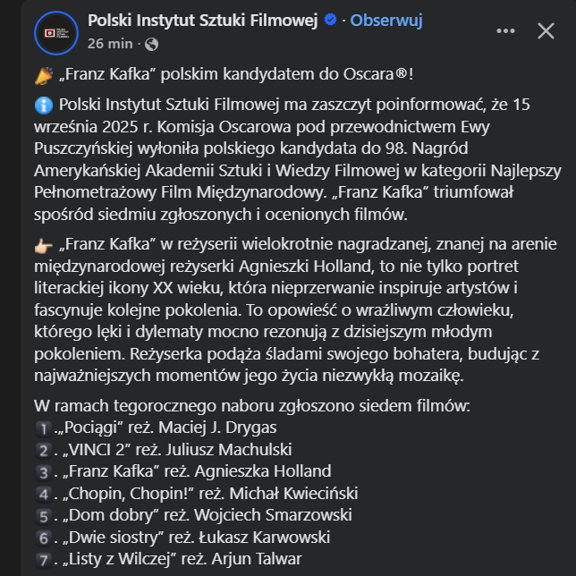 Cytat z Marek Pilarski data 15 września, 2025, 12:05I tak chyba nie mamy nic mocnego, co miałoby szanse na nominację.