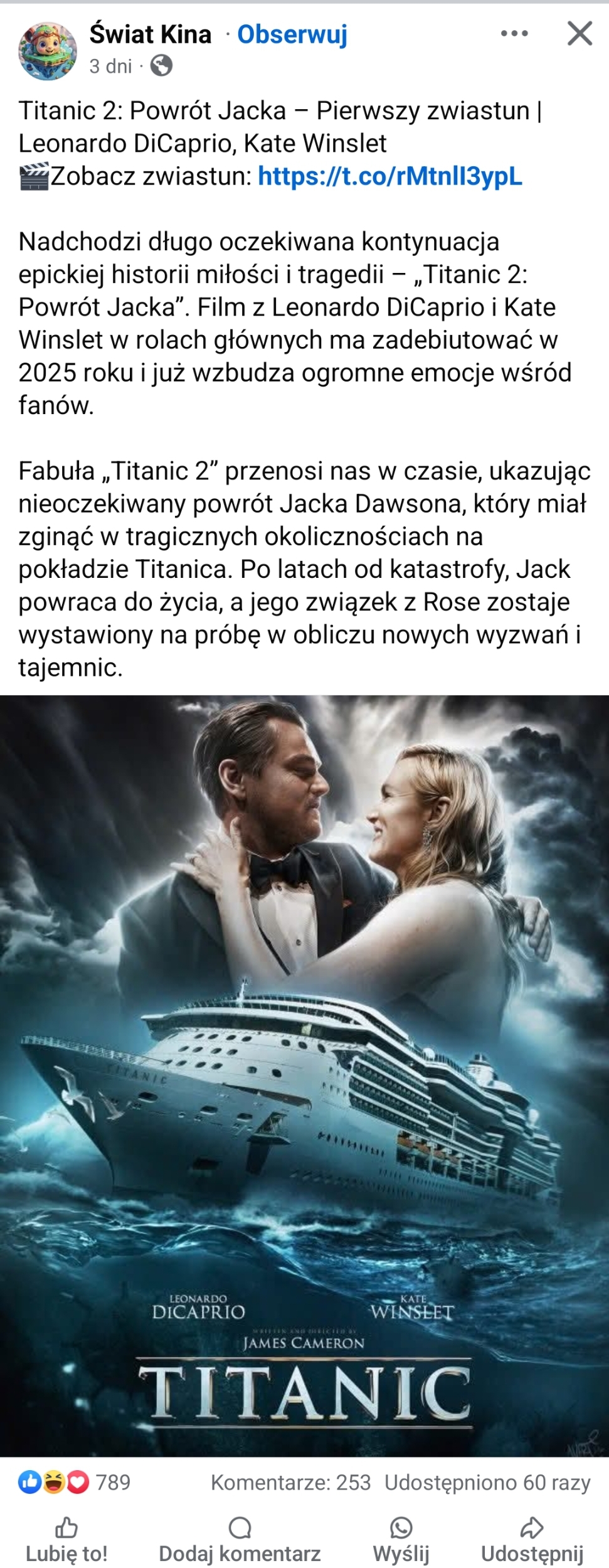 Cytat z Marek Pilarski data 10 stycznia, 2025, 23:10Ten fanpage ma ponad 15 tys. obserwujących, a bazuje tylko i wyłącznie na fejkowych informacjach oraz stworzonych przez AI plakatach. Nie wiem, czy od początku tak było, ale to jest przerażające, jak dużo osób sądzi, że te informacje są prawdziwe albo po prostu zastanawia się w komentarzach, czy są prawdziwe, gdy na pierwszy rzut oka widać, że to fejk..