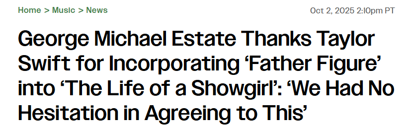 Cytat z Mierzwiak data 11 października, 2025, 22:52Cytat z Marek Pilarski data październik 11, 2025, 22:21Na nowym albumie Taylor Swift jest utwór, który ma pożyczony tytuł i melodię z "Father Figure" George'a Michaela.