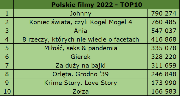 Wzrosty – choć mniejsze niż w przypadku starszych filmów grozy czy familijnych tytułów – odnotowały polskie produkcje. Jednak Johnny wyprzedził Koniec Świata, czyli Kogel Mogel 4 (760 485 widzów) i stał się najpopularniejszą rodzimą premierą tego roku. Po tym weekendzie na jego koncie znajdowało się 790 274 sprzedanych biletów, ale teraz wiemy już, że udało mu się przekroczyć pułap 800 tys. Wydaje się, że Johnny może powalczyć także o milion, a co za tym idzie, może stać się dopiero drugim polskim filmem od początku pandemii, któremu uda się osiągnąć ten pułap (po Dziewczynach z Dubaju / 1 163 496). Jednak kolejny potencjalny milioner trafi do kin już jutro (Listy do M. 5).