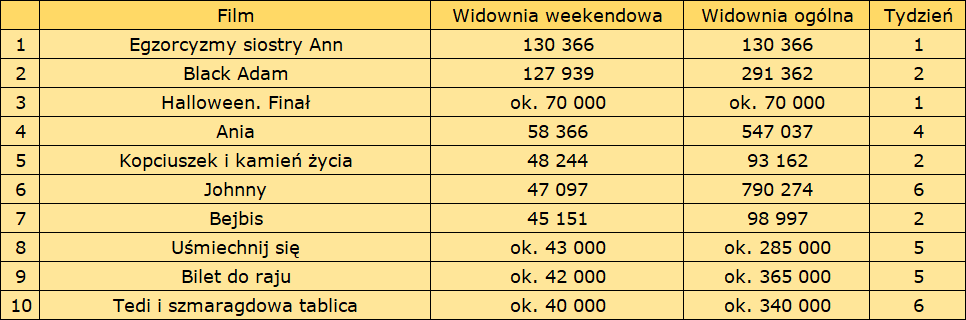 Tymczasem nowość poprzedniego weekendu – Black Adam – przegrała z Ezgorcyzmami siostry Ann o niespełna 3 tys. widzów. Film z Dwaynem Johnsonem odnotował dzięki niedzielnej promocji niewielki wzrost względem otwarcia i zgromadził przed ekranami prawie 128 tys. osób. Od premiery zostało już sprzedanych ponad 290 tys. biletów. Wygląda na to, że film ten stać ostatecznie na wynik w okolicach pół miliona widzów, co będzie oznaczało trzeci najlepszy rezultat pośród filmów DCEU: