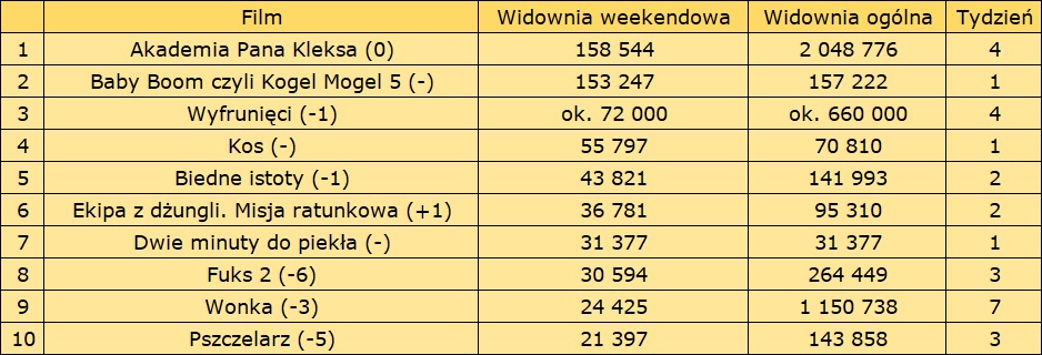 Po raz pierwszy w tym roku pojawiła się szansa na objęcie prowadzenia w weekendowym zestawieniu przez inny film niż Akademia Pana Kleksa. Polski megahit, który przekroczył właśnie pułap dwóch milionów sprzedanych biletów odparł jednak atak innego rodzimego tytułu. Jest nim grany premierowo Baby Boom czyli Kogel Mogel 5.