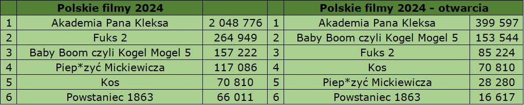 Akademię Pana Kleksa zobaczyło podczas czwartego weekendu 158 544 widzów (-15%), a w sumie już do kin wybrało się już 2 048 776 osób. Tytuł ten wyprzedził Chłopów (1 827 259 widzów) i jest teraz największym rodzimym przebojem od początku pandemii. To także pierwszy od czasu Miszmasz czyli Kogel Mogel 3 (2,39 mln) polski film, który przekroczył pułap dwóch milionów sprzedanych biletów. A skoro już mowa o Koglu Moglu – piąta część wystartowała z poziomu 153 247 widzów, co jest wynikiem otwarcia słabszym niż w przypadku poprzednika sprzed dwóch lat (222 189 widzów). A między wynikami piątej i trzeciej części isntnieje po prostu przepaść. W 2019 roku tamten film zgromadził podczas premierowego weekendu 578 016 widzów. Przy „nogach” zbliżonych do tych, które miała część czwarta (słaby współczynnik x3,425 względem otwarcia) nowość przekroczy w rozrachunku końcowym tylko nieznacznie pułap 500 tys. sprzedanych biletów.