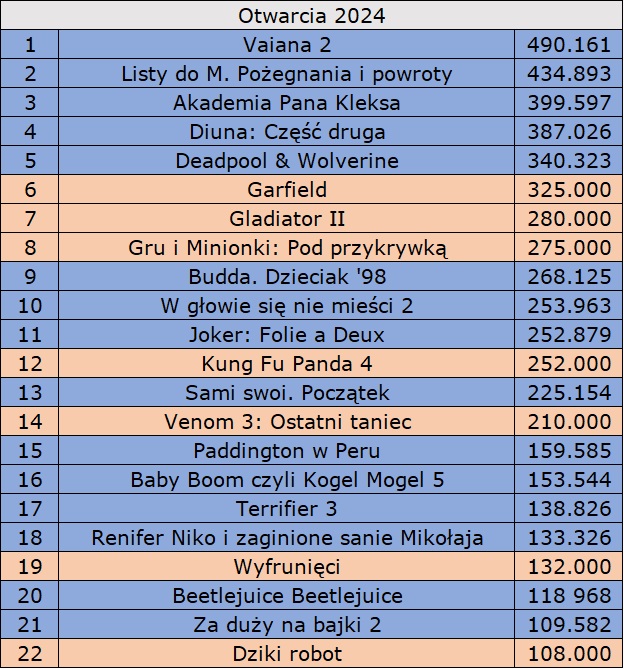 Nie ma mocnych na Vaianę 2. Druga część jej przygód przyciągnęła podczas drugiego weekendu wyświetlania jeszcze ponad 380 tys. widzów (-22%), co dawało jej w sumiue prawie 1,12 mln widzów po pierwszych dwunastu dniach wyświetlania. To dziesiąta tegoroczna premiera, która przekroczyła pułap miliona. Odnotowany tym razem wynik jest najlepszym w tym roku rezultatem jakiegokolwiek filmu z drugiego weekendu wyświetlania oraz jest gorszy od zaledwie czterech najlepszych tegorocznych otwarć. Na mały spadek wpływ miały oczywiście mikołajki. W ten weekend można spodziewać się większego spadku. Wydaje się jednak, że Vaiana 2 ostatecznie zgromadzi u nas ponad 2 mln widzów i tym samym poprawie trzykrotnie wynik pierwszej części (671 tys.).