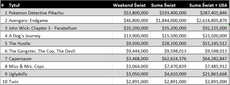 Na dobre kończy się monotonia w światowym box office, a to głównie dzięki premierze John Wick 3 i dość małym spadkom Detective Pikachu. Ten drugi został liderem weekendowego zestawienia z wpływami na poziomie $53,8 mln. Jednocześnie cały czas czekamy na odpowiedź na najważniejsze pytanie tego roku (zaraz za „Kto zasiądzie na żelaznym tronie?”) – Czy Avengers: Endgame prześcignie Avatara w klasyfikacji wszech czasów.