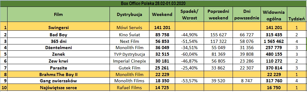 Parasite znów zaliczyło najniższy procentowy spadek wśród filmów w TOP 10. Od czasu powrotu do kin (14 lutego) obejrzało go już 150 tys. widzów. Po weekendzie odbyły się jeszcze seanse w Heliosach w ramach Kinie Konesera. Te cieszyły się nadal dużym zainteresowaniem. Poza tym w pierwszej dziesiątce znalazło się jeszcze miejsce dla dwóch nowości: horroru Brahms: The Boy II oraz – dość niespodziewanie – Najświętszego serca.