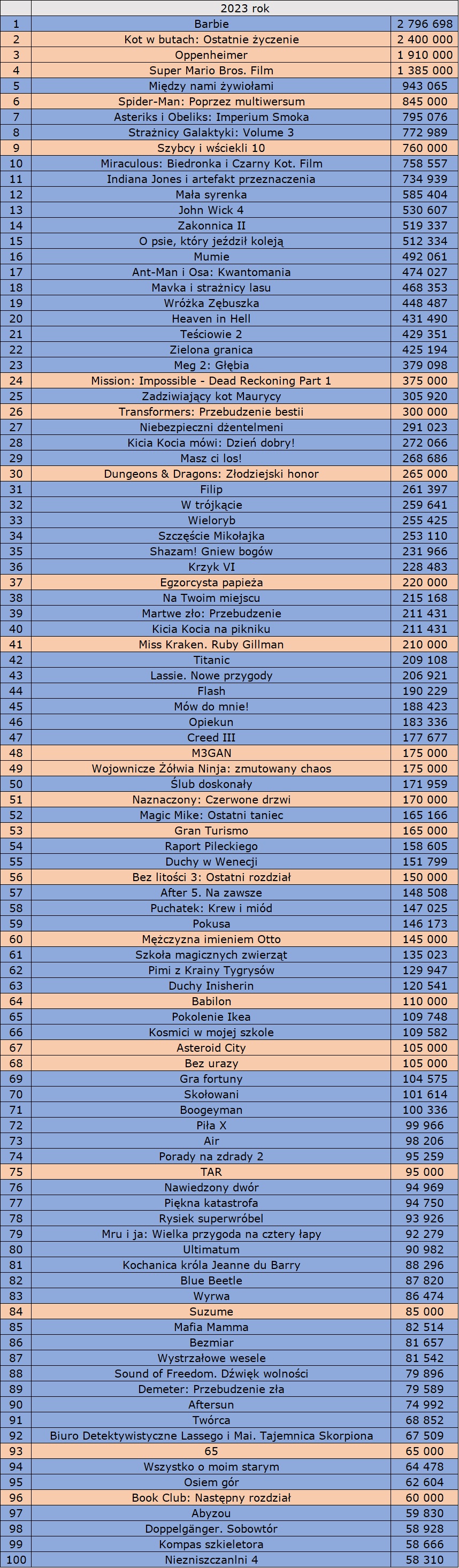 Na koniec mamy dla Was jeszcze zestawienie stu najchętniej oglądanych premier 2023 roku w polskich kinach po pierwszych trzech kwartałach: