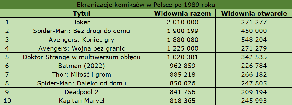 Tymczasem Thor: Miłość i grom niedługo przeskoczy pułap 900 tys. widzów. W tej chwili tytuł ten posiada na swoim koncie nieco ponad 885 tys. sprzedanych biletów, co daje mu trzecie miejse na oficjalnej liście największych przebojów tego roku, siódme miejsce w nieoficjalnym zestawieniu (uwzględniącym tytuły dystrybutora UIP) oraz pośród najpopularniejszych ekranizacji komiksów po 1989 roku:
