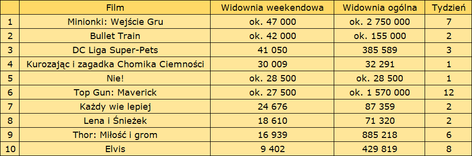 Tytuły z oficjalnego TOP10 weekendu zgromadziły ok. 160 tys. widzów. To spadek o nieco ponad 10% względem poprzedniego tygodnia. W sumie w kasach polskich kin mogło zostać sprzedanych jednak prawie 300 tys. biletów, choć dwie ostatnie nowości dystrybutora UIP nie przyciągają takich tłumów jak ich filmy z pierwszej połowy sezonu letniego, które nadal znajdują się w czołówce najchętniej oglądanych obecnie tytułów na ekranach polskich kin. Oficjalnym numerem jeden jest DC Liga Super-Pets z widownią na poziomie nieco ponad 41 tys. Faktycznym zwycięzcą weekendu była jednak przypuszczalnie inna animacja, Minionki : Wejście Gru, która podczas swojego siódmego weekendu mogła zgromadzić jeszcze prawie 50 tys. widzów. W sumie na jej koncie może znajdować się już ok. 2,75 mln sprzedanych biletów.
