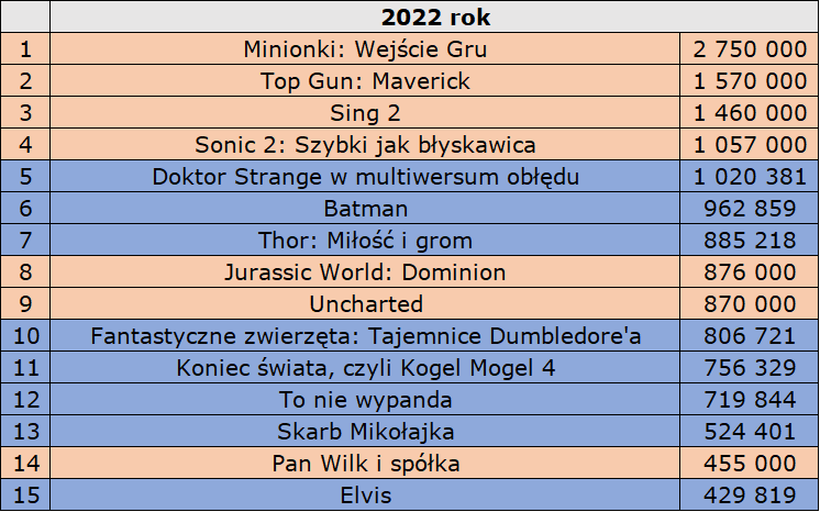 Lepiej od Nie! spisała się inna nowość, animacja Kurozając i zagadka Chomika Ciemności, którą podczas premierowego weekendu zobaczyło 30 009 widzów. Wśród czterech najpopularniejszych obecnie filmów w polskich kinach są zatem aż trzy animacje. Minionki walczą obecnie o przekroczenie pułapu 3 mln widzów, z kolei DC Liga Super-Pets idzie w kierunku półmilionowej widowni. Na koncie tego drugiego filmu znajduje się obecnie 385 tys. sprzedanych biletów. To wynik dający w tej chwili dziesiąte miejsce na oficjalnej liście największych tegorocznych przebojów. Pogoda podczas najbliższego weekendu powinna sprzyjać wszystkim filmom, a szczególnie animacjom.