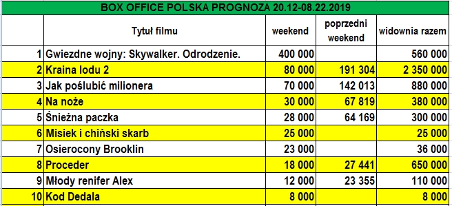 Gwiezdne Wojny: Skywalker. Odrodzenie obejrzy w weekend prawdopodobnie ok. 400 tys. widzów. Film miał od środy seanse przedpremierowe i spodziewamy się, że łączna widownia wyniesie ok. 560 tys. Wynik ten oznaczałby dopiero szóste miejsce wśród najlepszych tegorocznych otwarć, za Królem Lwem (470 tys.) a przed Kobietami mafii 2 (374 tys.). Poprzednia część, Ostatni Jedi zgromadziła w ciągu pierwszych pięciu dni 782 tys. widzów, a w sam weekend 559 tys. Wygląda na to, że w tym przypadku otwarcie będzie zbliżone do tego, które zaliczył Łotr 1 – 506 tys. w pięć dni i 384 tys. w weekend. Oprócz tego, że recenzje i opinie widzów są mieszane, to jego premierę wyznaczono w samym środku świątecznych przygotowań i zakupowego szału. Dwa lata temu premierę wyznaczono pięć dni wcześniej. To, że nie jest to dobra data na premierę w Polsce wskazuje zeszłoroczny start Aquamana, który w ciągu pierwszych pięciu dni zgromadził tylko 153 tys. widzów, a za tydzień 169 tys. w ciągu 3 dni. Zresztą widownia prawie wszystkich filmów wyświetlanych w tamtym roku przed Wigilią była niższa niż w weekend po Świętach.