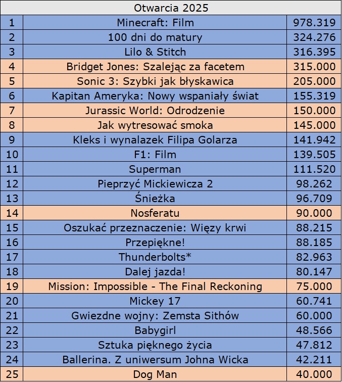 Wzrosty widowni odnotowały także skierowane do dzieci i rodzin Jak wytresować smoka (ok. 53 tys. widzów / +53% / razem ok. 850 tys. widzów) oraz Lilo & Stitch (41 tys. / +51% / razem 1,782 mln), a także Heidi ratuje rysia (32 tys. / +66% / razem 91 tys.). Z kolei Elio utrzymało stałą widownię w okolicach 20 tys. widzów podczas swojego czwartego weekendu wyświetlania. Najnowszy film studia Pixar przekroczył właśnie pułap 200 tys. sprzedanych biletów i w ciągu niespełna miesiąca osiągnął dziesięciokrotność widowni z weekendu otwarcia.