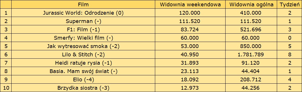 Podczas premierowego weekendu w polskich kinach Superman zgromadził 111 520 widzów, co oznacza jedenaste najlepsze tegoroczne otwarcie. Nie było one jednak wystarczająco dobre, żeby przeskoczyć Jurassic World: Odrodzenie, które podczas drugiego weekendu wyświetlania odnotowało zaledwie 20-procentowy spadek widowni i przyciągnęło do kin ok. 120 tys. widzów. Po pierwszych dziesięciu dniach wyświetlania na koncie tego filmu znajdowało się już prawdopodonie ponad 400 tys. sprzedanych biletów. Jeżeli tytuł ten utrzyma dobrą formę w kolejnych tygodniach, to być może uda mu się wyprzedzić w rozrachunku końcowym Jurassic World: Upadłe królestwo, które z widownią w okolicach 850 tys. jest najpopularniejsza częścią trylogii Jurassic World z lat 2015-2022.