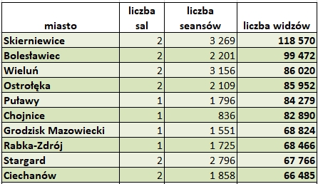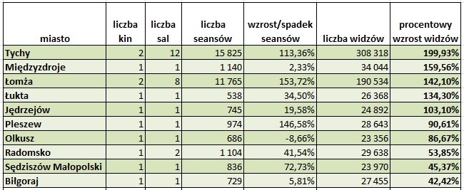 Największy wzrost procentowy został odnotowany w Tychach (200%), ale to dlatego, że liczba seansów wzrosła o ponad 100% z powodu otwarcia nowego multipleksu. W Międzyzdrojach wzrost wyniósł 159%, ale tam liczba seansów była tylko o 2% większa niż przed rokiem. Więcej o 142 % biletów sprzedano w Łomży, ponieważ otwarto tam kino Helios i to liczące 62 tys. osób miasto ma obecnie aż 8 sal kinowych. W czołówce wzrostów widowni (na 4. miejscu – 147%) znalazła się licząca jedynie 1210 mieszkańców wieś Łukta. Liczba seansów wzrosła tam o 35%, a w ciągu roku sprzedano ponad 26 tys. biletów, co oznaczałoby, że każdy mieszkaniec odwiedził kino 20 razy. Prawdopodobnie znaczną część widzów stanową turyści, bo wieś jest położona nad jeziorami niedaleko Ostródy.