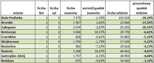 Tylko w 21 miastach zanotowano spadek liczby widzów. Największy (aż 30%) w Białej Podlaskiej. To zaskakujący wynik na tle całego kraju, bo liczba seansów pozostała na podobnym poziomie. Duże spadki były też w Brzesku (23,5%) oraz Zakopanem (20%). W pozostałych miastach spadki nie przekroczyły 7%.
