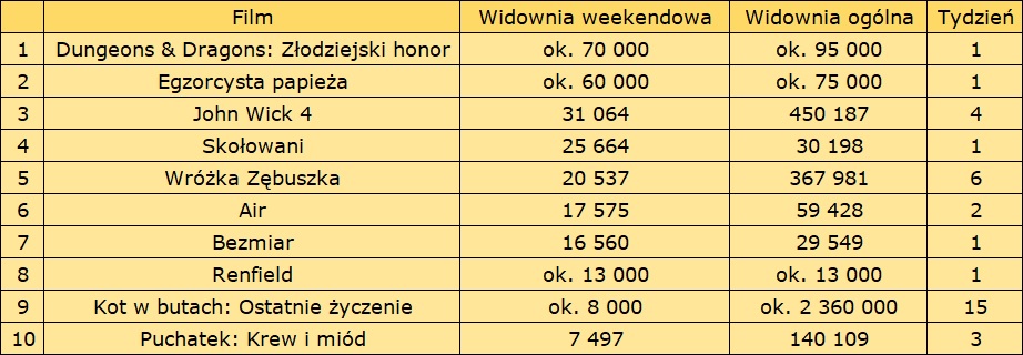 Dystrybutorem dwóch najchętniej oglądanych filmów minionego weekendu jest UIP, w związku z czym nie są one widoczne w w oficjalnych statystykach. Co ciekawe, UIP wprowadziło do kina tym razem aż trzy nowości. Oprócz ekranizacji gry oraz horroru na ekranach pojawił się Renfield, który zgromadził ok. 13 tys. widzów. A naszym alternatywnym TOP10 znalazł się jeszcze także czwarty film tego dystrybutora: Kot w butach: Ostatnie życzenie (ok. 8 tys. widzów podczas piętnastego weekendu!). Tylko te cztery tytuły mogły odpowiadać w poprzedni weekend za prawie połowę wszystkich sprzedanych biletów (ok. 350 tys.). Numerem jeden było przypuszczalnie Dungeons & Dragons: Złodziejski honor, który od piątku do niedzieli mógł zgromadzić ok. 70 tys. widzów, a wraz z pokazami przedpremierowymi już blisko 100 tys.. Tylko nieco słabiej spisał Egzorcysta papieża, którego w sam weekend mogło zobaczyć ok. 60 tys. widzów. W związku z tym, że jego premiera odbyła się w środę 12 kwietnia, po pierwszym weekendzie na jego koncie znajdowało się ok. 75 tys. widzów.