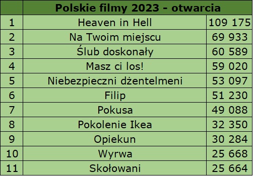W pierwszej dziesiątce aż połowę miejsc zajmują nowości. Jedną z nich jest polska komedia romantyczna Skołowani, którą na 263 kopiach zobaczyło 25 664 widzów, a wraz z pokazami przedpremierowymi nieco ponad 30 tys.. Taki wynik wystarczył do zajęcia jedenastego miejsca na liście najlepszych tegorocznych otwarć polskich filmów: