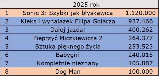 Jeszcze przed weekendem pułap miliona przekroczył Sonic 3: Szybki jak błyskawica, który tym razem był drugim najchętniej oglądanym filmem. Tym razem zobaczyło go jeszcze ok. 70 tys. widzów, a w sumie już ponad 1,1 mln, co sprawia, że jest on najpopularniejszą częścią serii w polskich kinach. Ostatecznie film ten zgromadzi więcej widzów niż Mufasa: Król Lew, który w światowych kinach sprzedaje się zdecydowanie lepiej niż trzecia część przygód niebieskiego jeżyka. Ostatecznie przebój Disneya również stał się w Polsce „milionerem”. Jest to ostatnia dwunasta (i ostatnia) zeszłoroczna premiera, której udało się przekroczyć ten pułap. Ale to nie koniec dobrych wieści dla domu Myszki Miki. Vaiana 2 stała się właśnie czwartą premierą 2024 roku z ponad dwumilionową widownią.