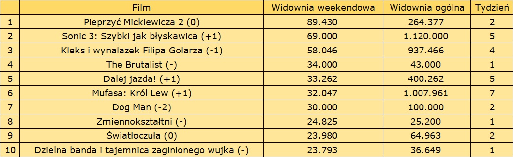 Miniony weekend był kolejnym bez Nosferatu na ekranach polskich kin. A przecież tydzień po pokazach przedpremierowych tego filmu nie było naprawdę mocnych premier. Najlepiej pośród nich spisał się The Brutalist tego samego dystrybutora, jednak na szczycie weekendowego zestawienia pozostało Pieprzyć Miczkiewicza 2, które już teraz posiada na swoim koncie zdecydowanie więcej widzów niż część pierwsza. Choć zabrakło tym razem filmu z widownią powyżej 100 tys., to aż dwanaście tytułów zgromadziło ponad 20 tys. widzów, a dwa kolejne były bardzo blisko tego pułapu.