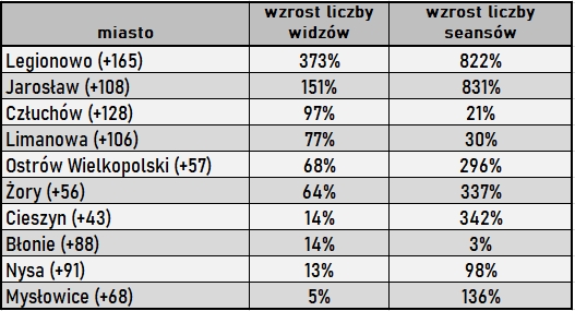 Tylko w dziesięciu miastach liczba widzów wzrosła. Wszystkie te miasta łączy to, że wzrosła w nich również liczba seansów, mimo że kina były otwarte o kilka miesięcy krócej niż w roku 2019. Powodem było powstanie nowych multipleksów (Żory, Cieszyn , Ostrów Wlk., Jarosław, Legionowo) lub otwarcie kin po remontach. Wzrost liczby widzów spowodował ogromne awanse tych miast w tabeli.